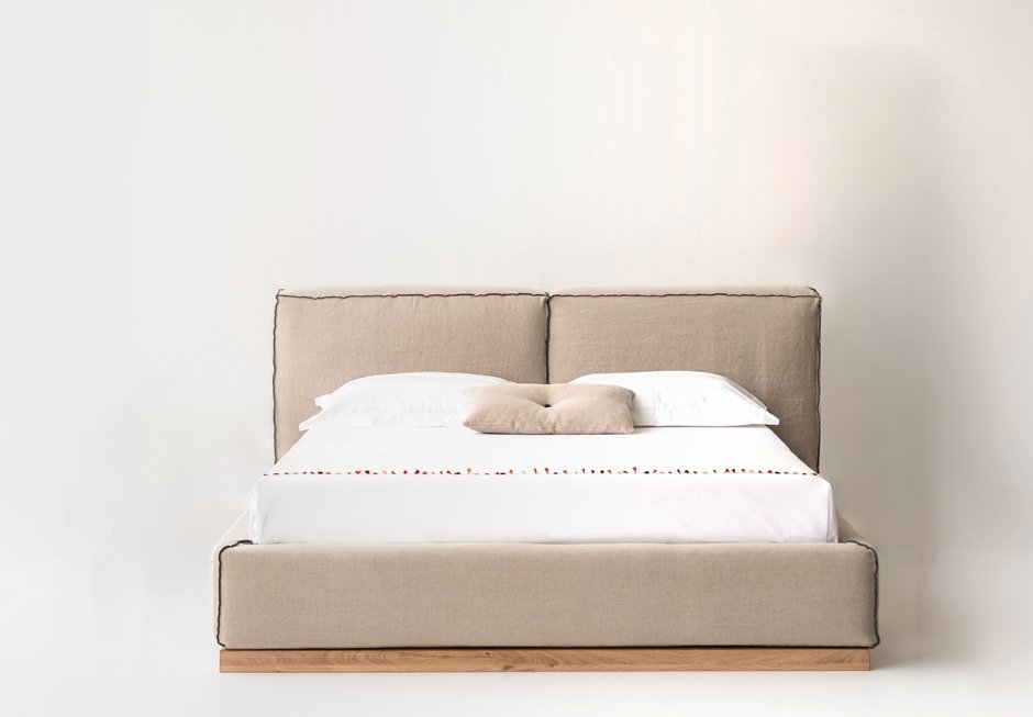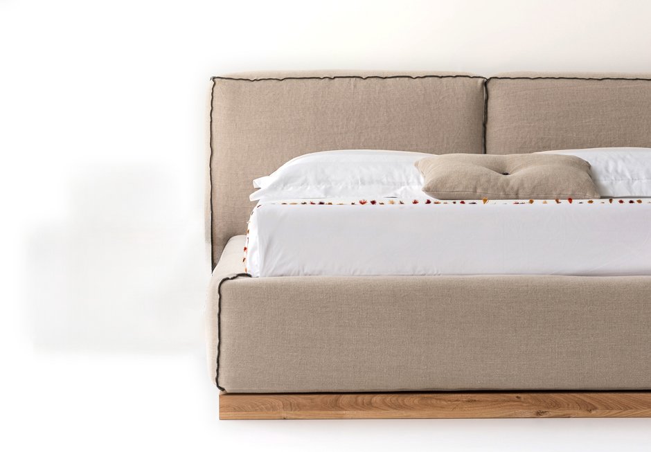 Bed made of dressed base with solid oak detail and headboard with removable fabric, for mattress 160×200 cm. It is available in a variety of fabrics and colors as well as different dimensions depending on the mattress. Upon request it has storage space.