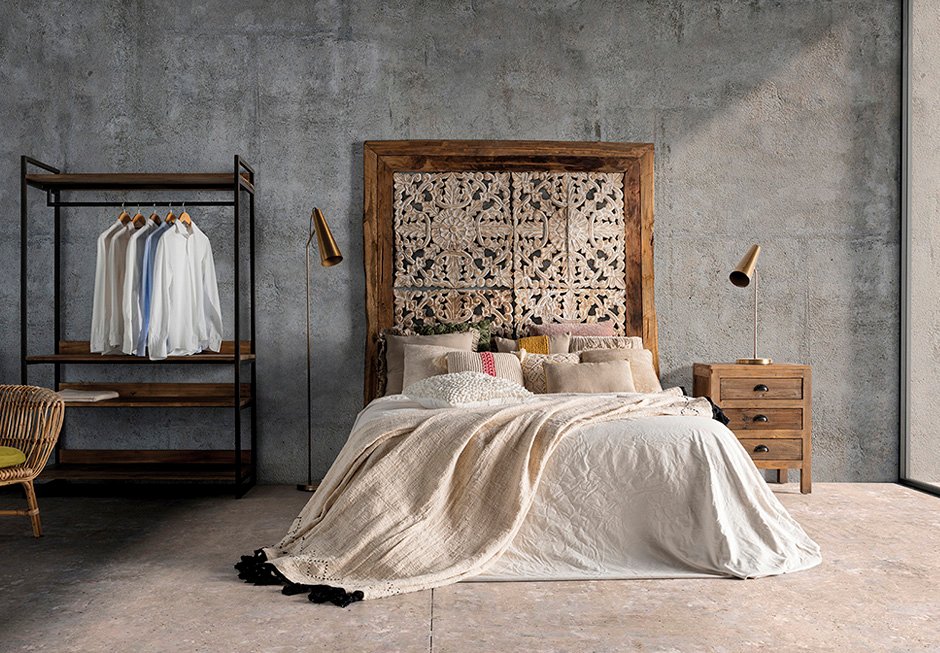 Bed dressed with removable fabric and wooden headboard with embossed patterns, for mattress 160×200 cm. It is available in a variety of fabrics and upon request is available with storage space.