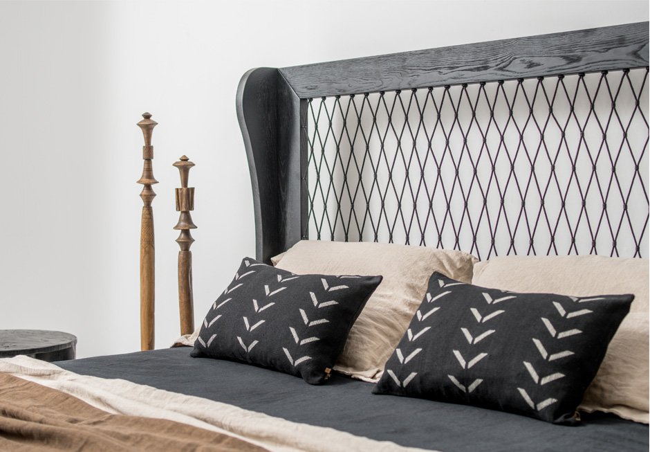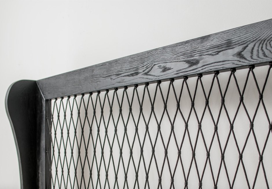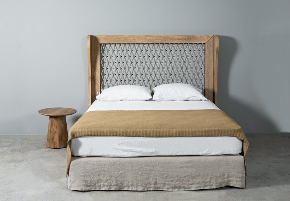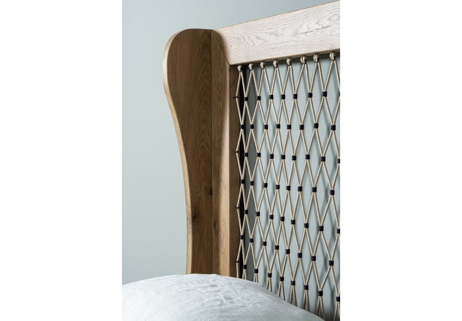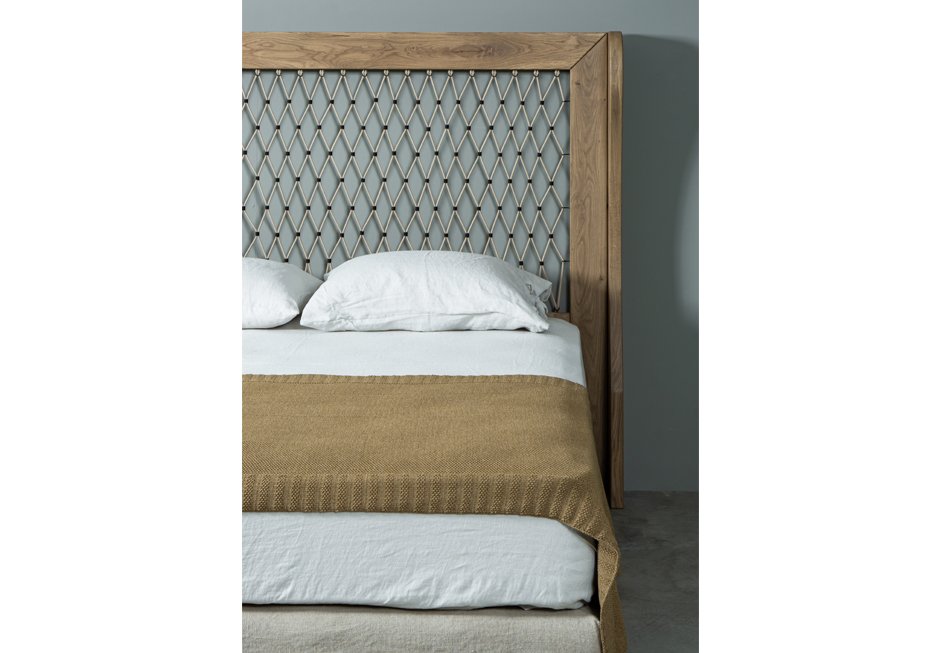 Bed dressed with removable fabric for mattress 160×200 cm. The headboard is made of solid oak and rope weave. Available in a variety of fabrics, colors and dimensions depending on the mattress. Upon request it has storage space.