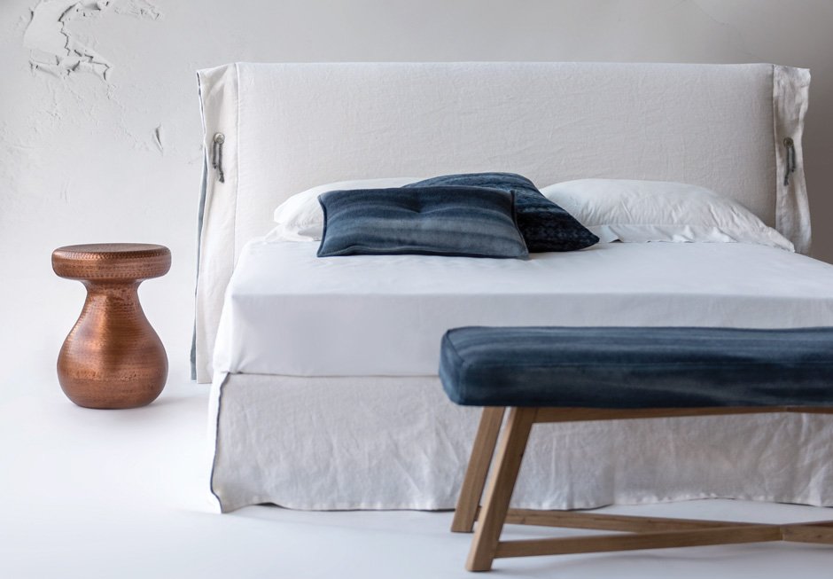 Dressed bed with removable fabric, for mattress 160×200 cm. The headboard has a two-tone internal pleat and a detail with button and string. It is available in a variety of fabrics and colors as well as different dimensions depending on the mattress. Upon request it has storage space.