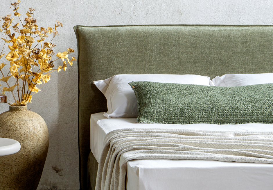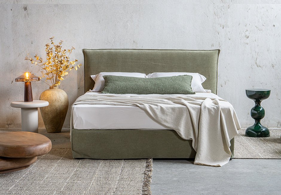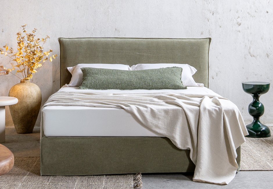Bed with headboard and dressed base. It is available in a variety of fabrics and colors as well as different dimensions depending on the mattress. Upon request it has storage space.