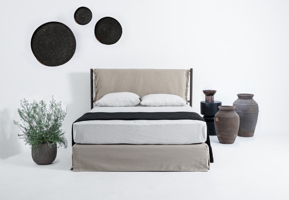 Bed dressed with removable fabric, for mattress 160×200 cm and headboard made of solid wood, dressed with fabric. Available in a variety of fabrics, colors and different dimensions depending on the mattress.