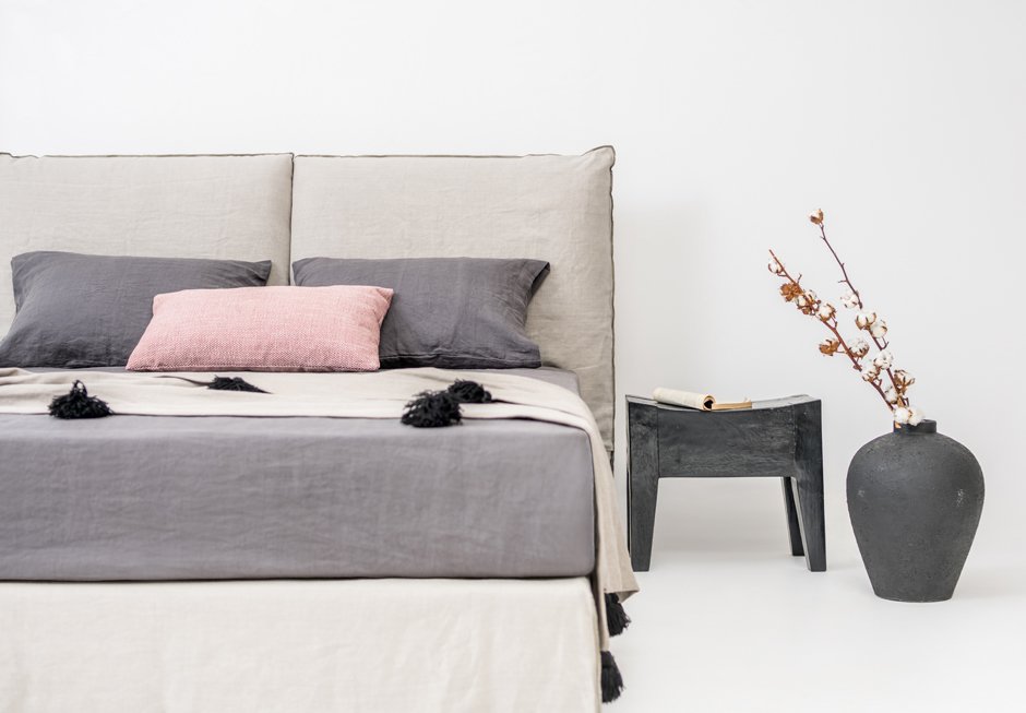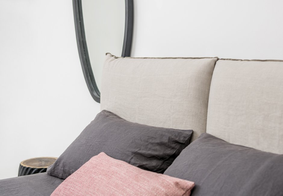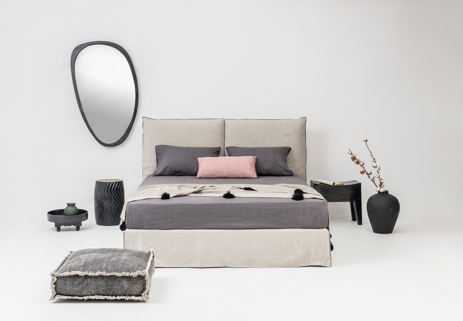 Bed dressed with removable fabric, for mattress 160×200 cm. It is available in a variety of fabrics and colors as well as different dimensions depending on the mattress. Upon request it is also available with storage space.