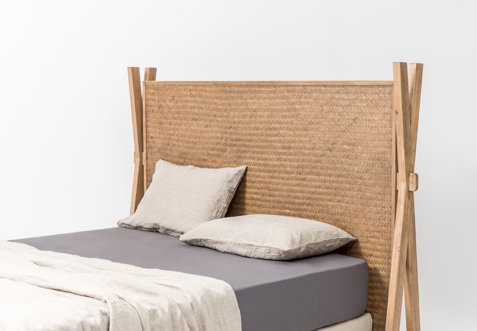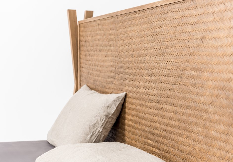 Bed dressed with removable fabric for mattress 160×200. It has a wicker headboard and an oak frame. Available in a variety of fabrics, colors and different dimensions depending on the mattress. Upon request it is available with storage space.