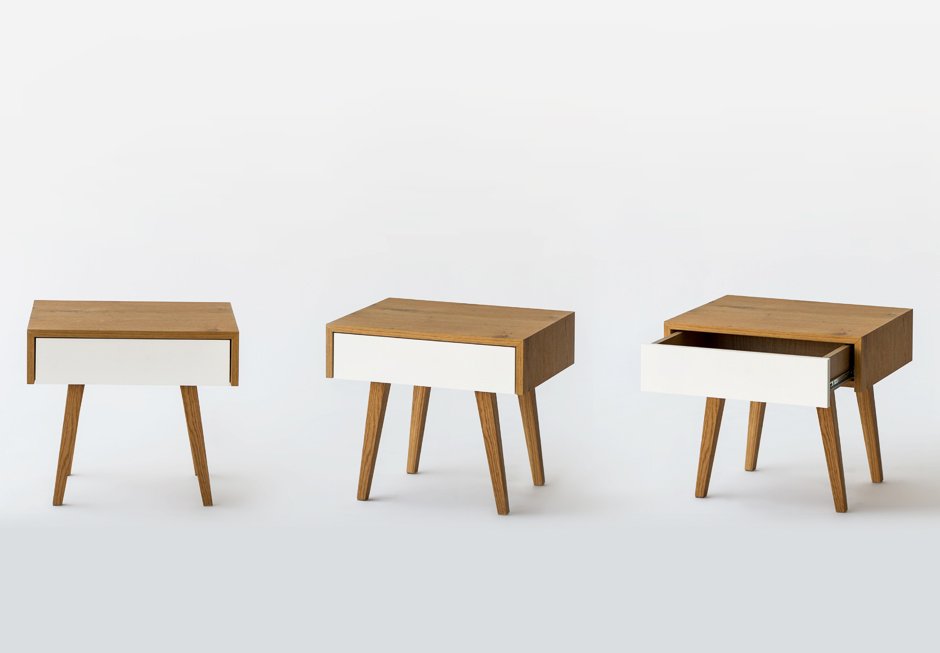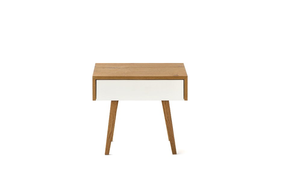 Bedside table made of oak wood with lacquer drawer. Available in dimensions 50x40x43h cm. Upon request in a variety of materials and colors.