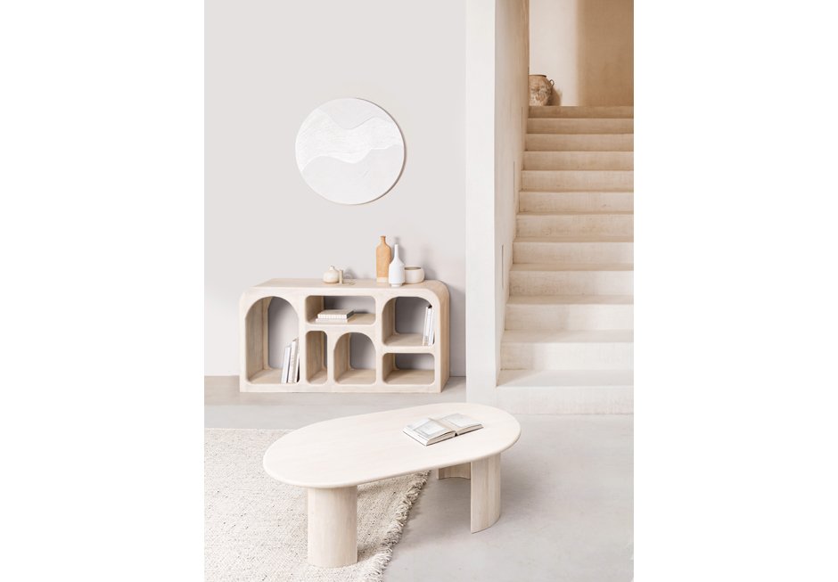 Console/bookcase made of mango wood in natural shade. Available in dimensions 145x35x75h cm.