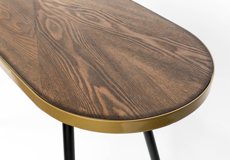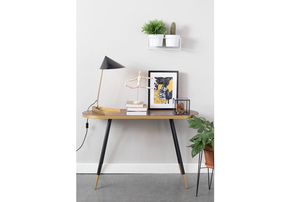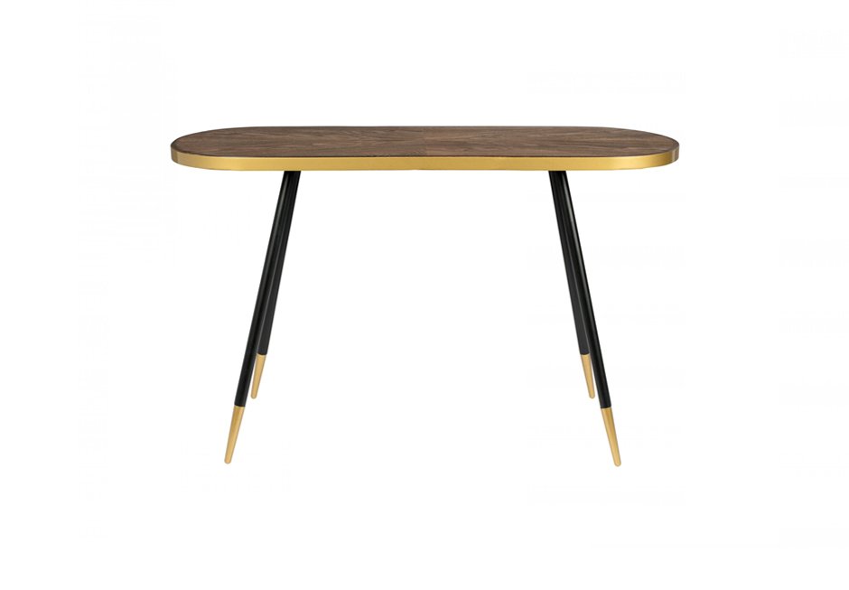 Console consisting of a surface with acacia wood veneer and black metal legs with gold detail. Available in dimensions: 121x41x75h cm