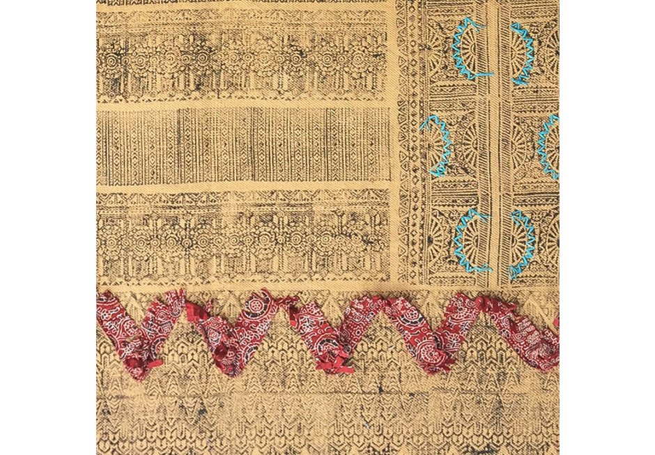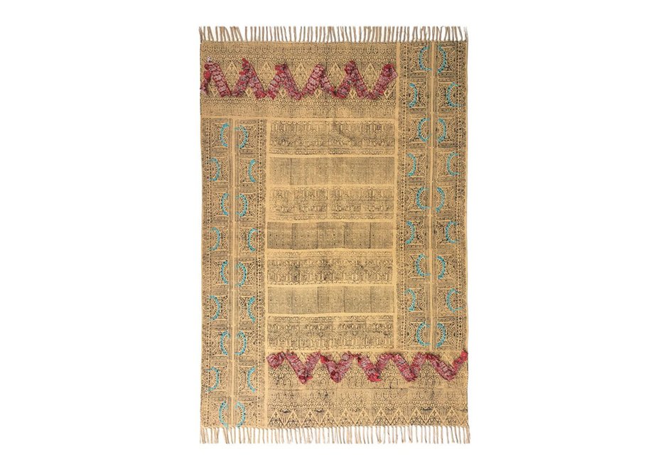 Cotton carpet, with details of turquoise thread and pieces of colorful cotton fabrics, sewn by hand. Available in dimensions 120×180 cm.