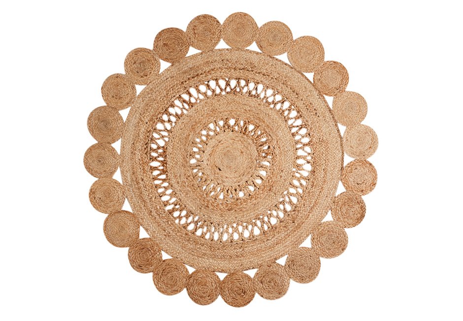 Carpet made of 100% jute, in natural color with white details. Available in Ø150 cm dimension.