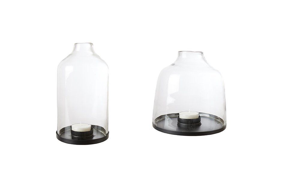 Glass jar with metal base and tealight case. Available in dimensions: L: 21x22h cm, M: 15x28h cm.