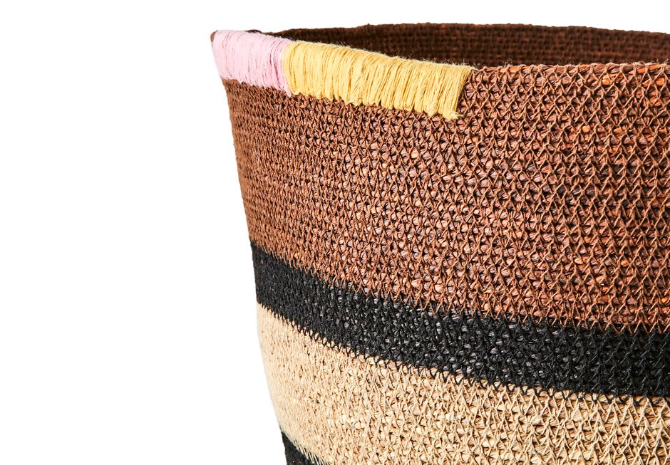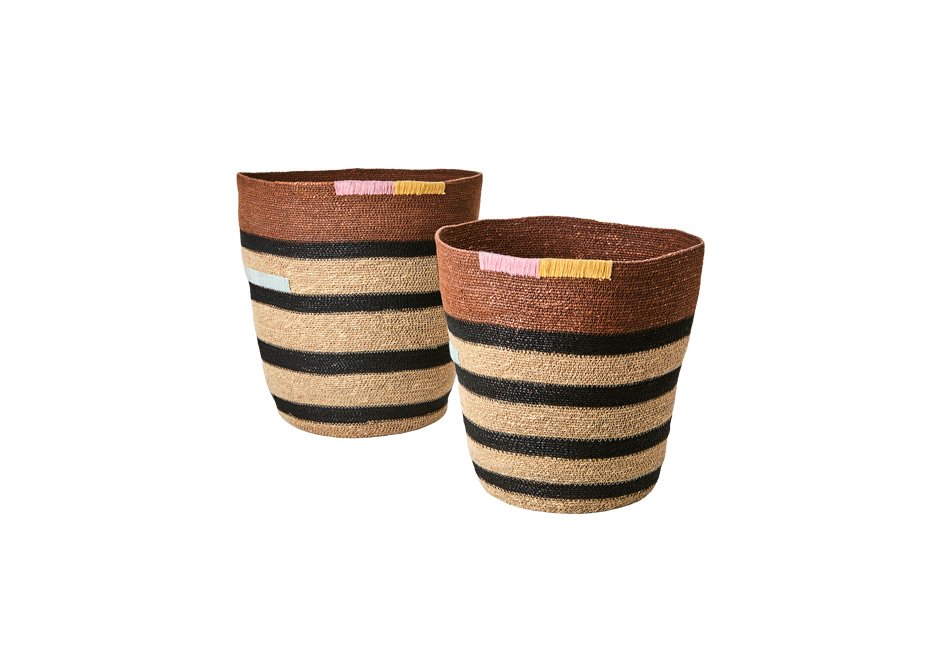 Baskets (set of 2) made of natural materials. Available in dimensions Ø26/37x37h cm and Ø27/42x42h cm.