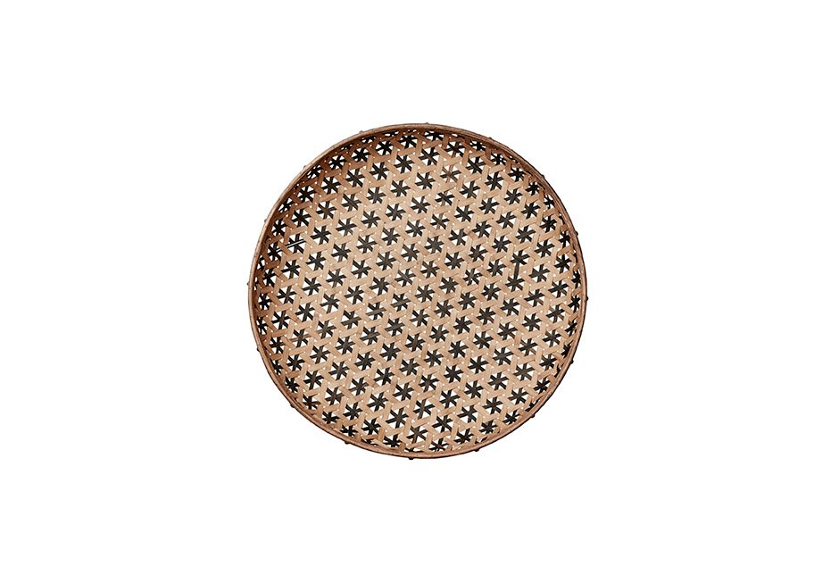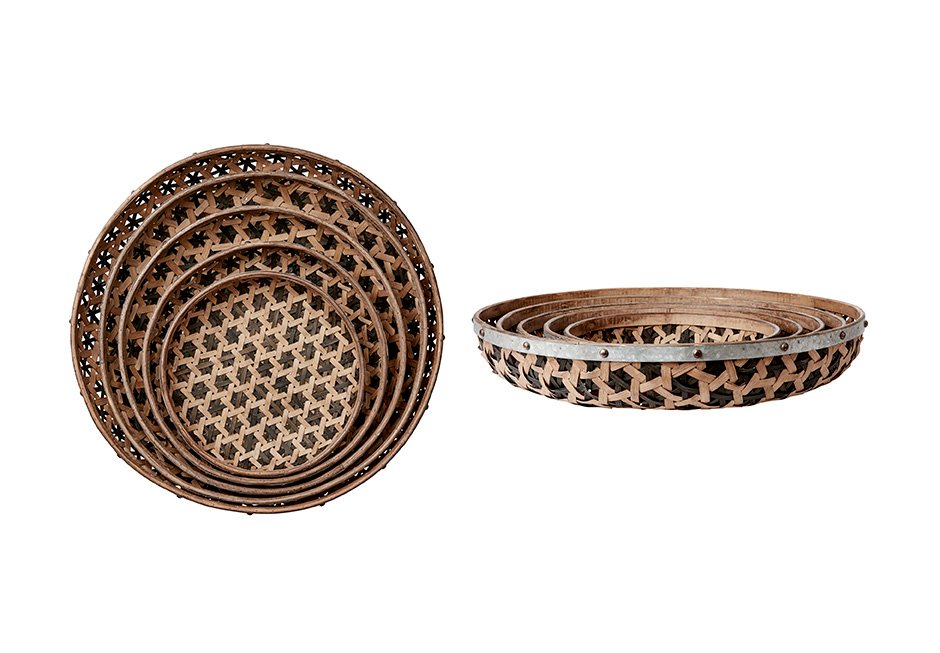 Decorative baskets made of natural material and wooden and metal details. Available as a set of 5 pieces in the following dimensions: Ø43xH9 cm, Ø50x10h cm, Ø59x11h cm, Ø68x12h cm, Ø75x13h cm.
