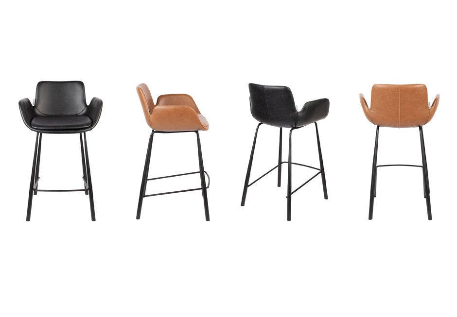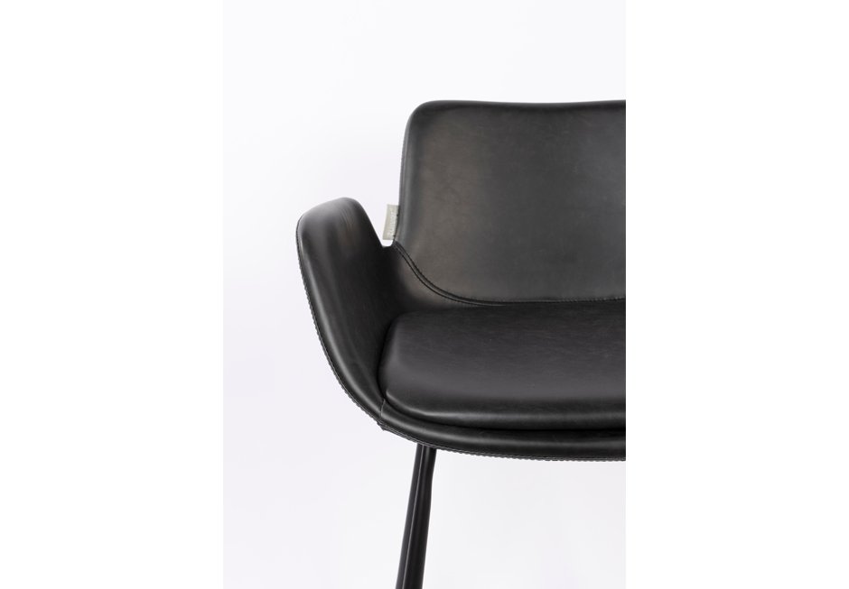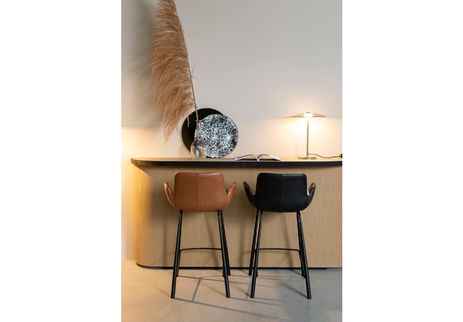 Stool for island with artificial leather in black and tampa color and black metal base. Available in dimensions: 57x54x91,5h cm with seat height 67,5 cm, seat depth 40 cm and armrest height 81 cm.