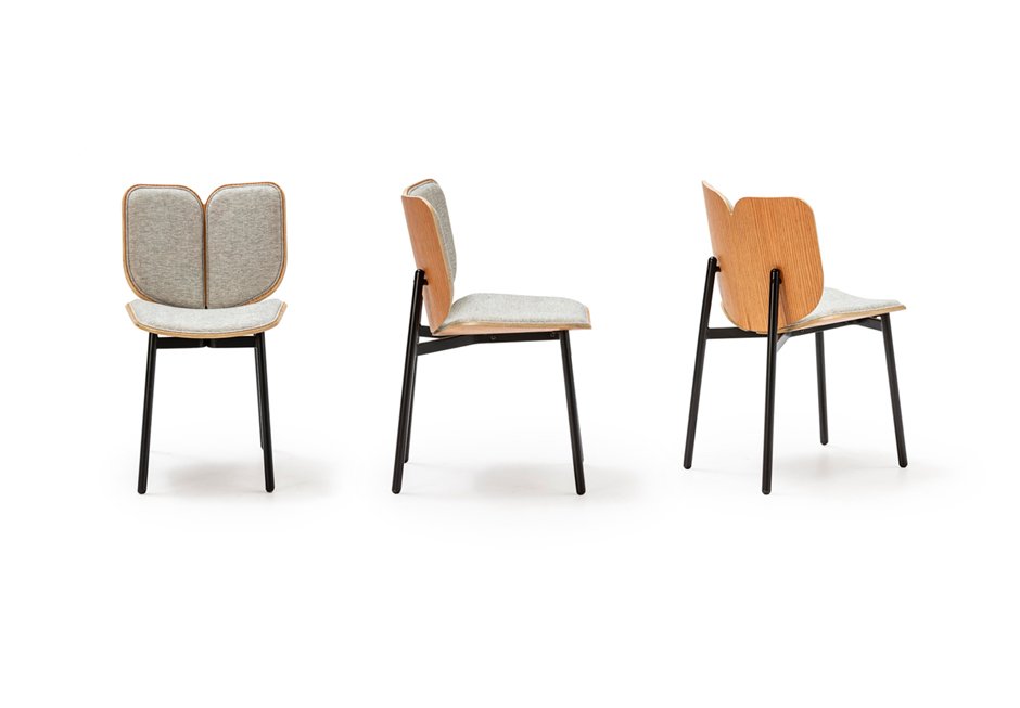 Chair with seat made of beech wood, upholstered in fabric in gray color and black metal legs. Available in dimensions 48x54x80h cm.