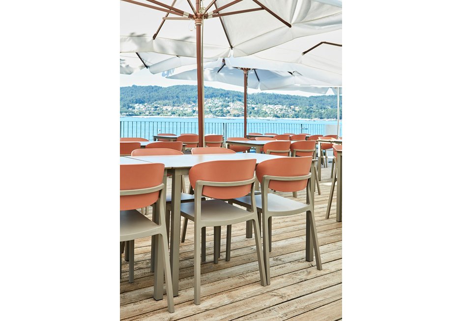 Stackable outdoor chair made of fiberglass reinforced polypropylene. Available in various shades upon request, with dimensions 49x51x78h cm and seat height 45h cm.
