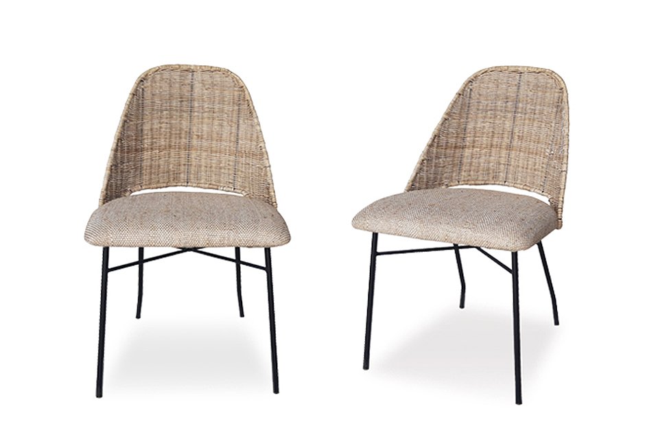 Chair with black, metal base, dressed seat and knitted back made of natural materials. Available in dimensions 51x57x83h cm.