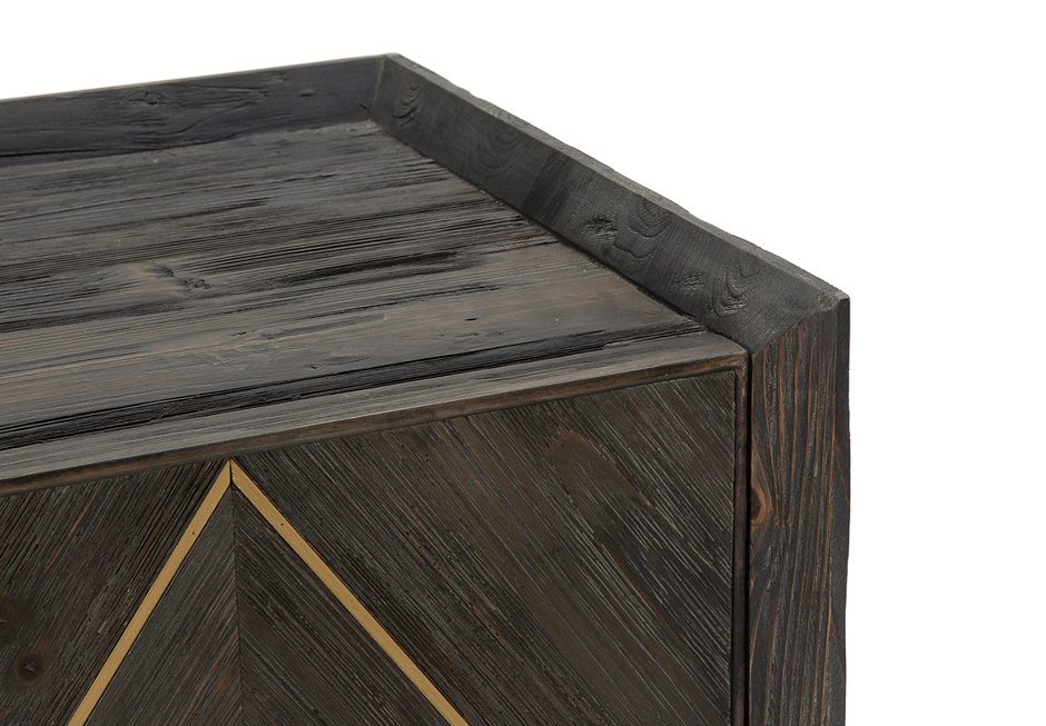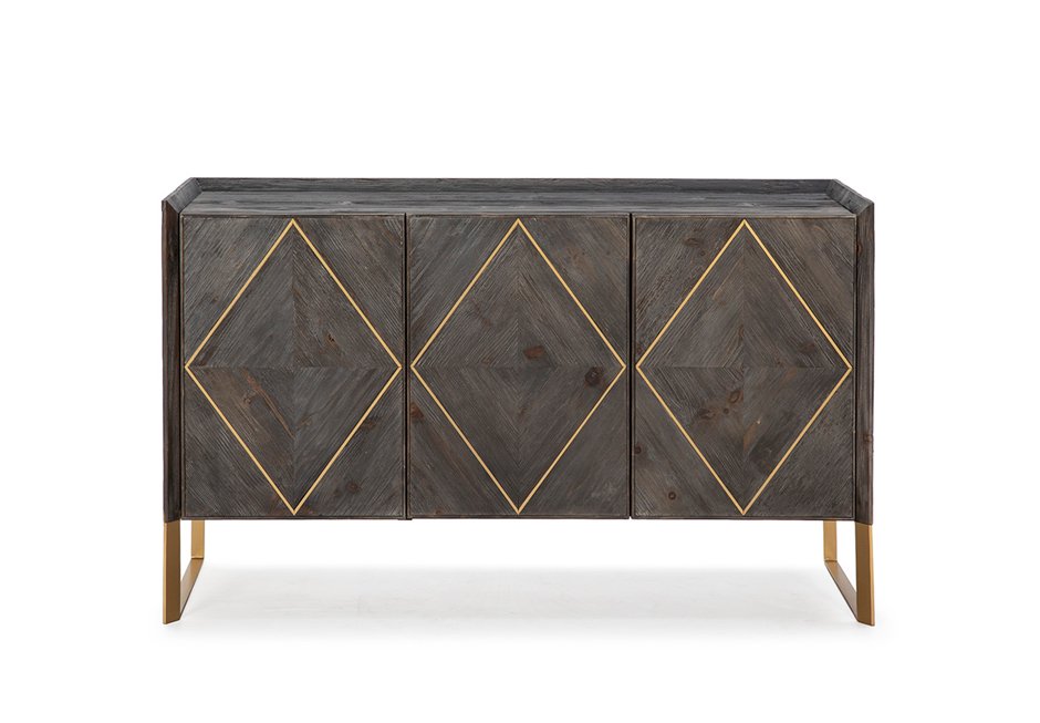 Buffers made of wood in dark grey (washed) color and bronze metallic details. It has three doors and a shelf. Available in dimensions: 146x50x88h cm.