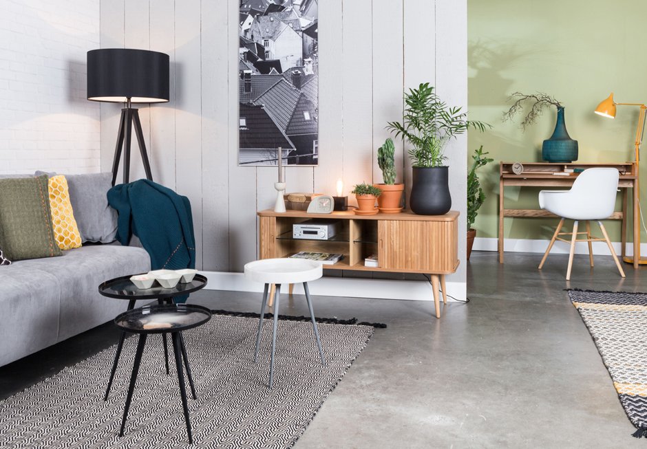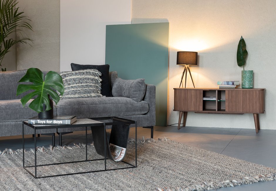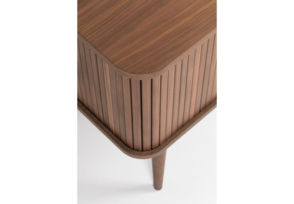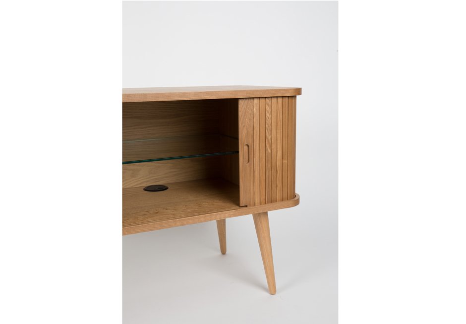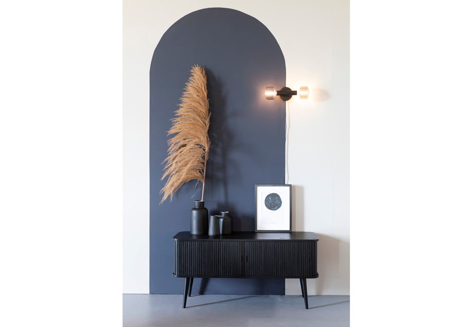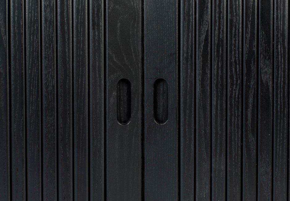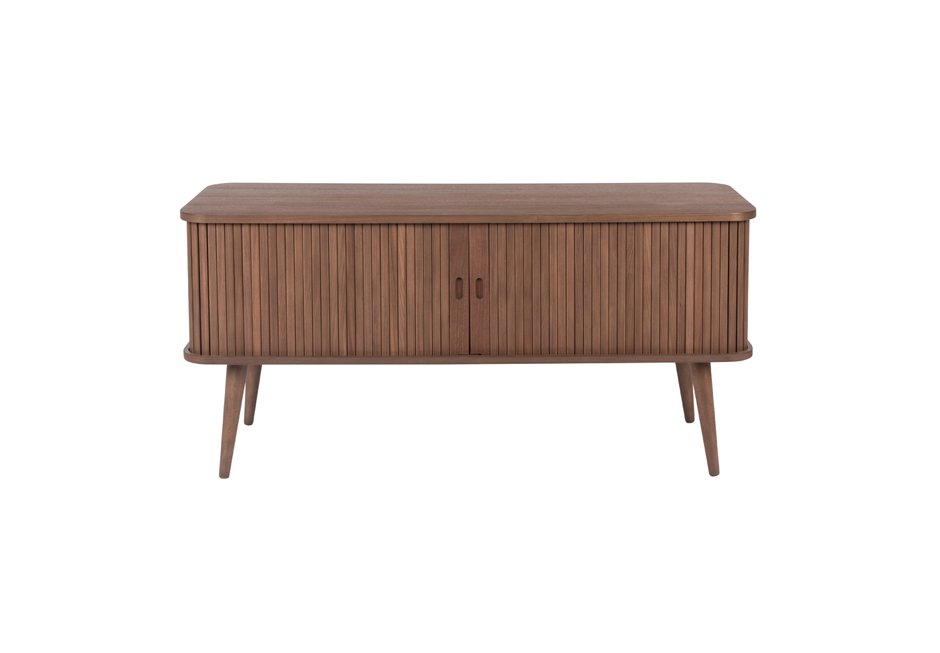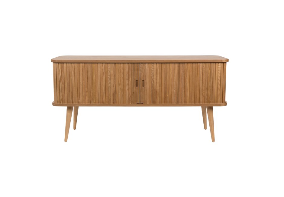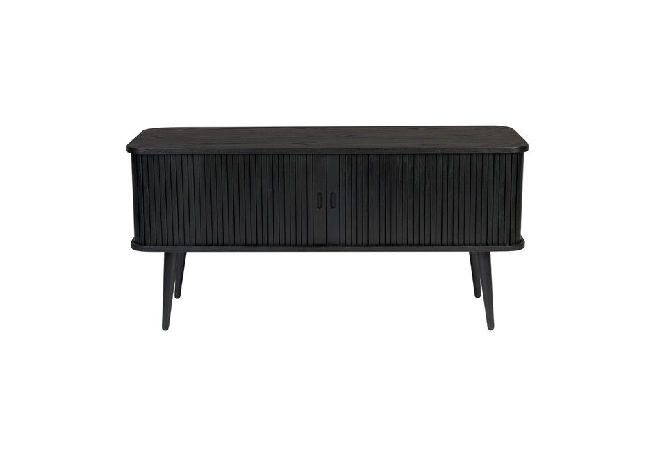 Sideboard in natural, walnut or black, with sliding doors that reveal two height-adjustable glass shelves with tapered legs. Available in dimensions 120x40x57,5h cm.