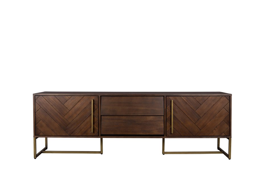 Sideboard with acacia wood veneer and frame in aged brass color. Available in dimensions 180x45x60h cm.
