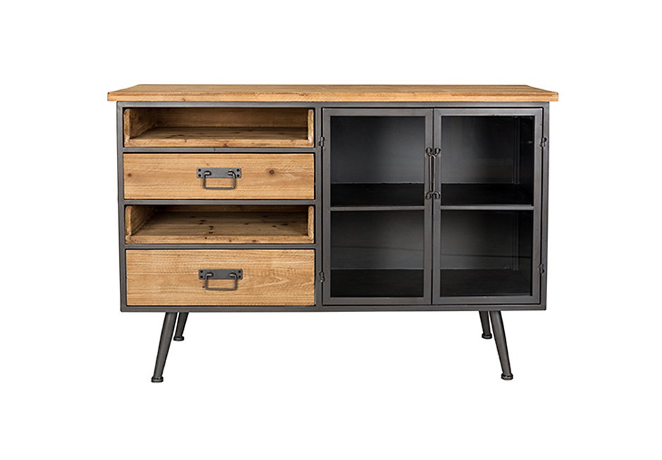 Sideboard made of metal frame and base, with fir wood surface. It has drawers, sliding shelves and glass doors. Available in dimensions 113x40x75h cm.