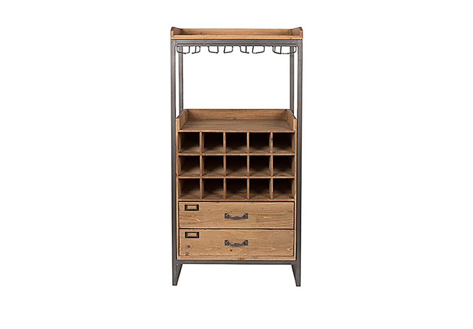 Sideboard made of metal frame and fir wood. It has metal hanging cup holders, bottle holders and drawers with fir wood façade. Available in dimensions 56x38x112.5h cm.