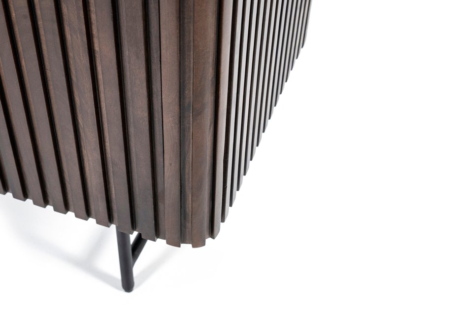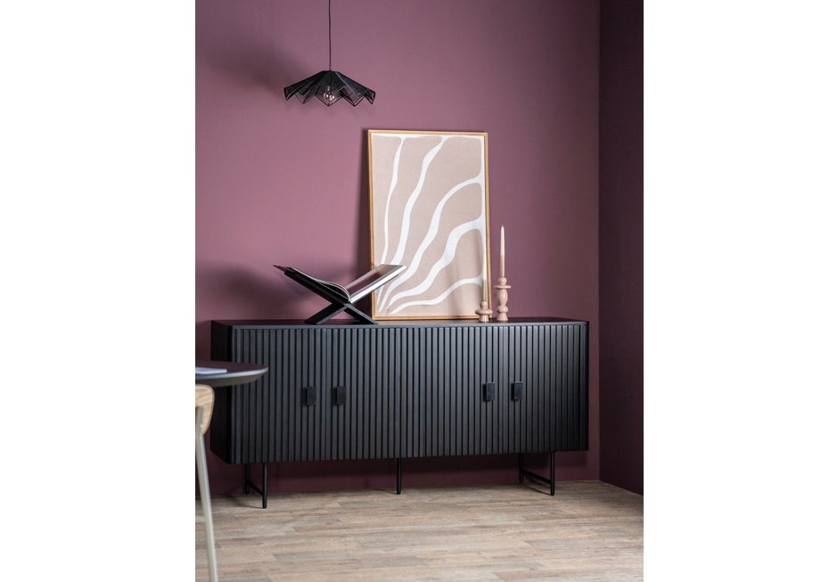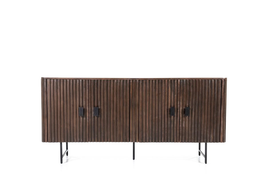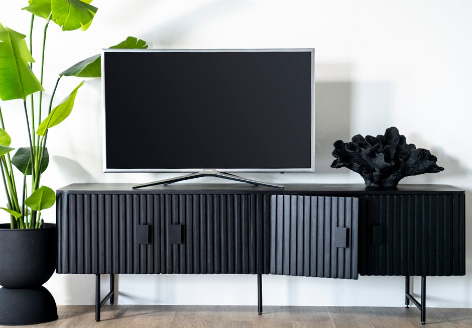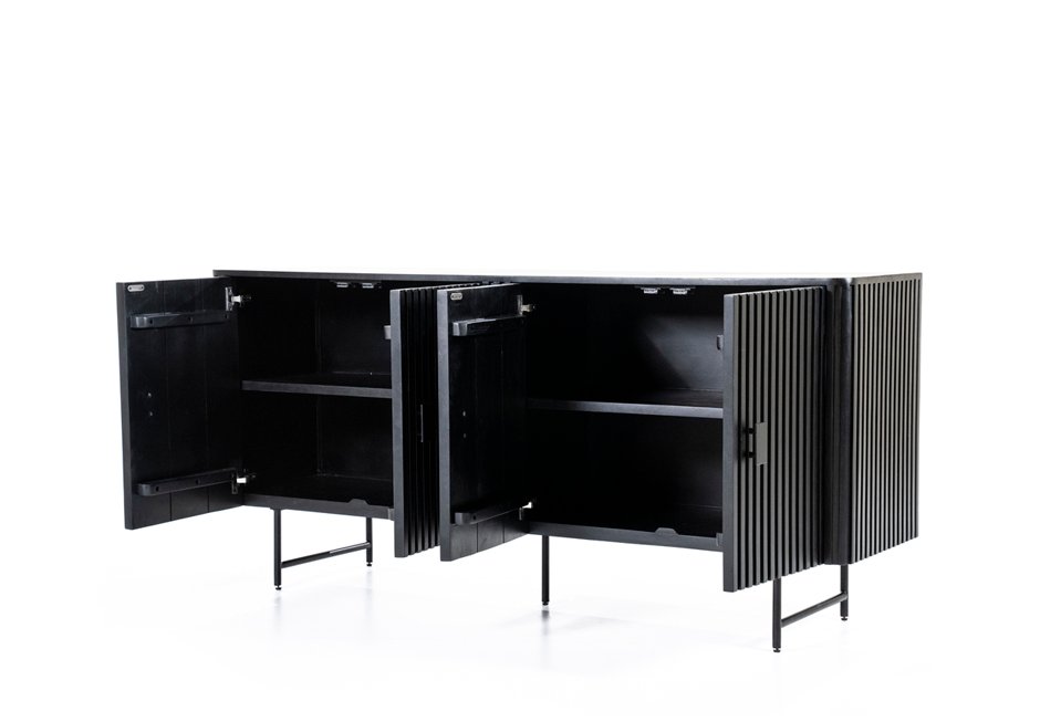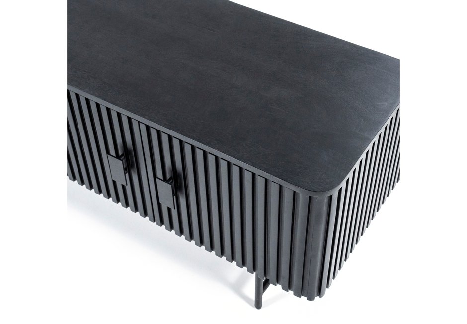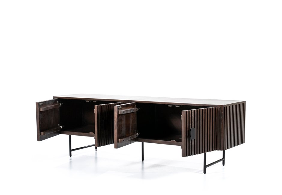 TV furniture with 4 doors, made of mango wood with black metal base and handles. Available in: