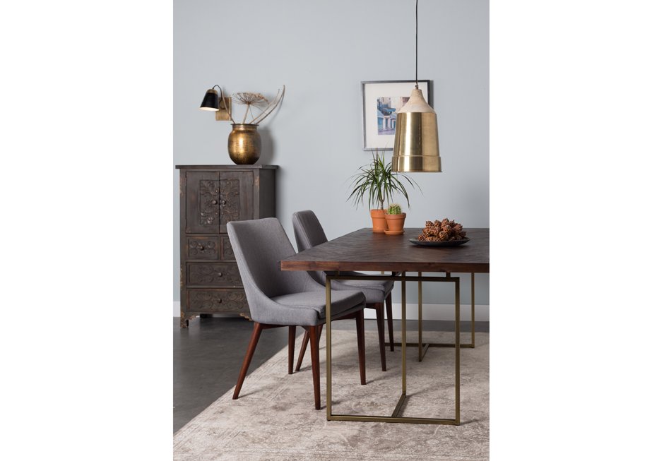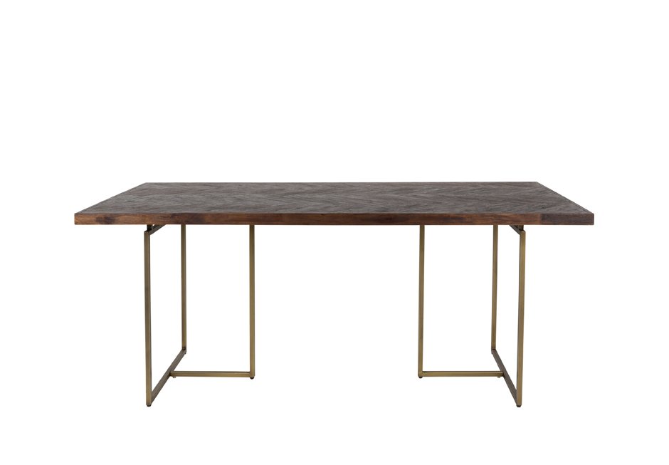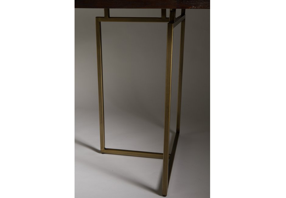 Table made of acacia in natural color and metal base in aged copper color. Available in dimensions 180/220x90x75h.