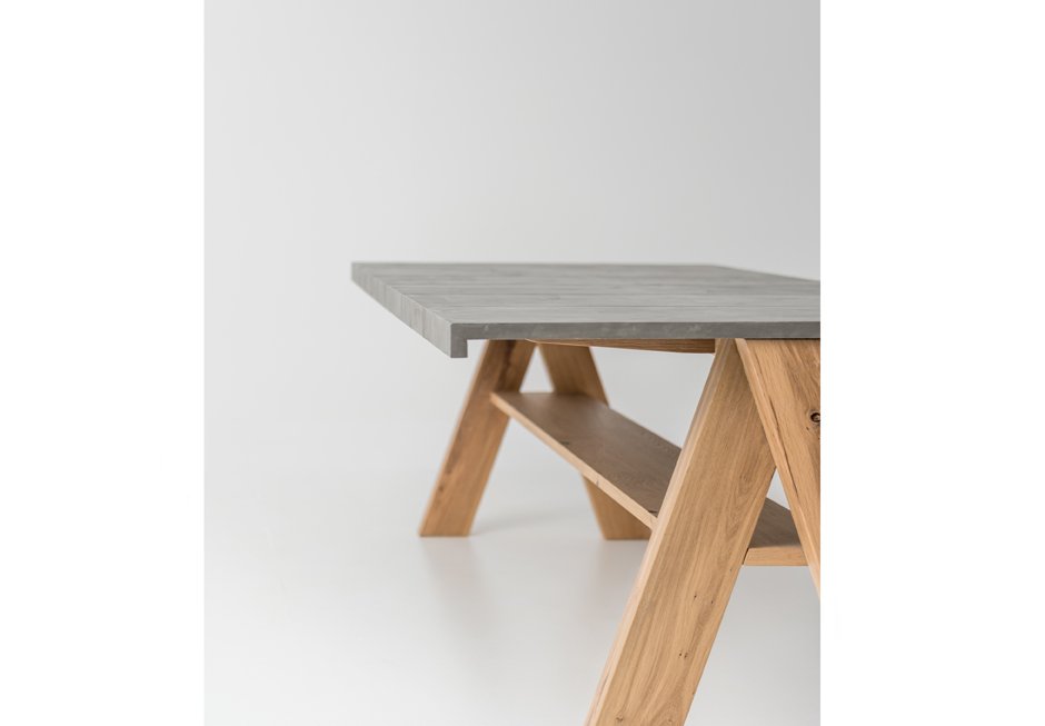 Table with oak base and cement mortar surface. Available in dimensions 250×100 cm. Upon request in a variety of materials, colors and dimensions.