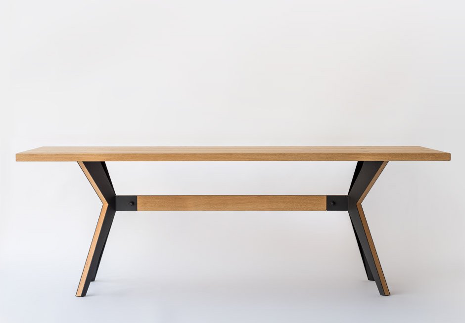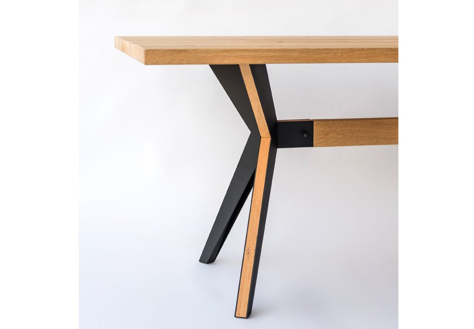 Table made of solid oak with metal details at the base and solid oak surface. Available in dimensions 200×90 cm. Upon request in a variety of dimensions and colors.