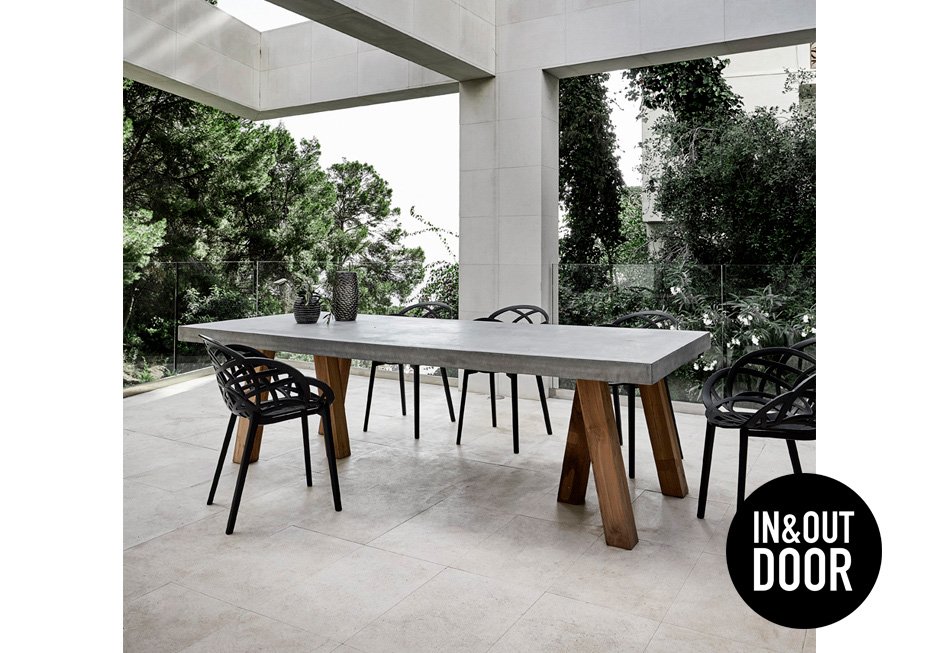 Table with base of oak, solid wood and cement mortar, surface. Available in dimensions 180-280x100x77h cm.