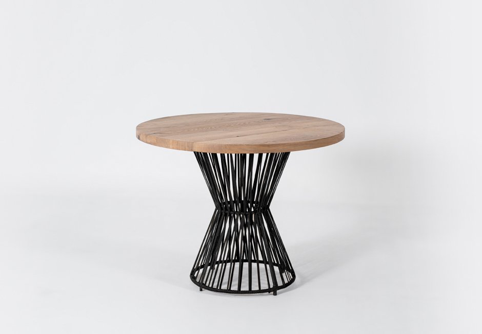 Rotunda in size from Ø95-120 cm, with oak wood surface and metal base with handmade knitting. Upon request in a variety of colors and materials.