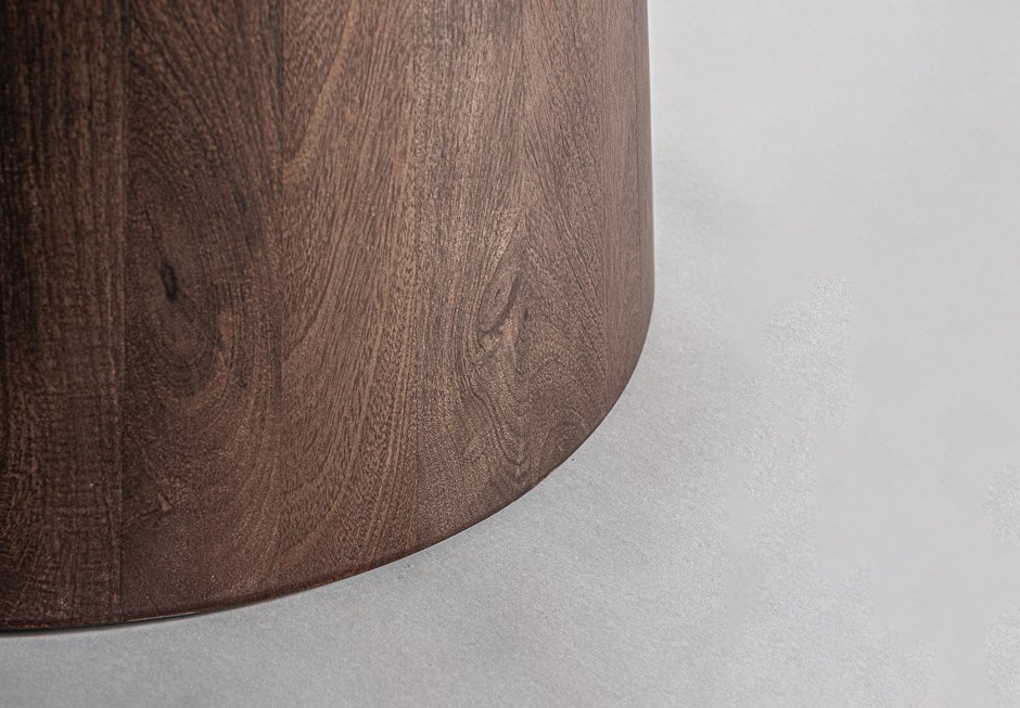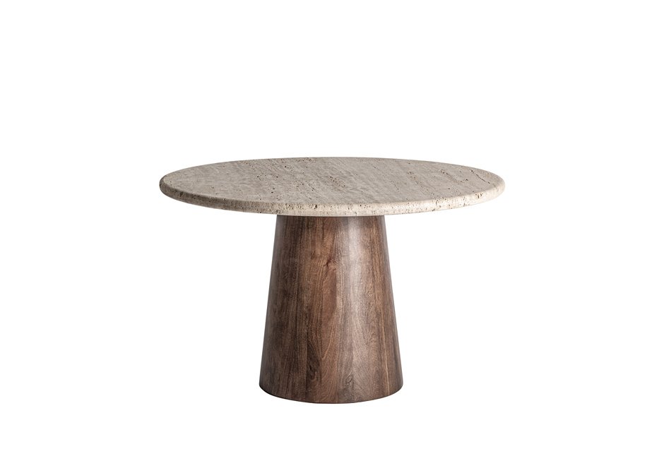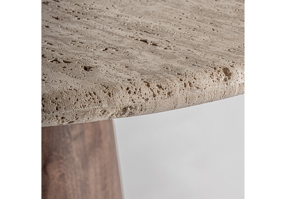 Rotunda with travertine surface in beige shade and base in mango wood in brown shade. Available in dimensions Ø130x81h cm.