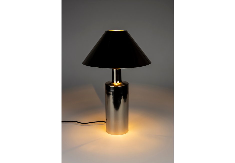 Metal table lamp in shiny silver and terra shade, contains lamp and cable.