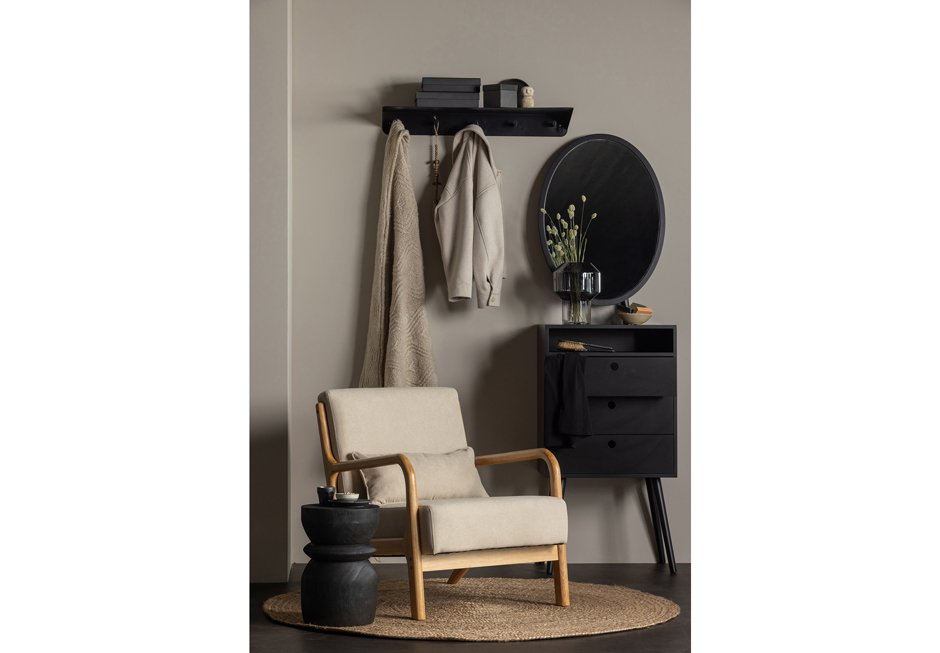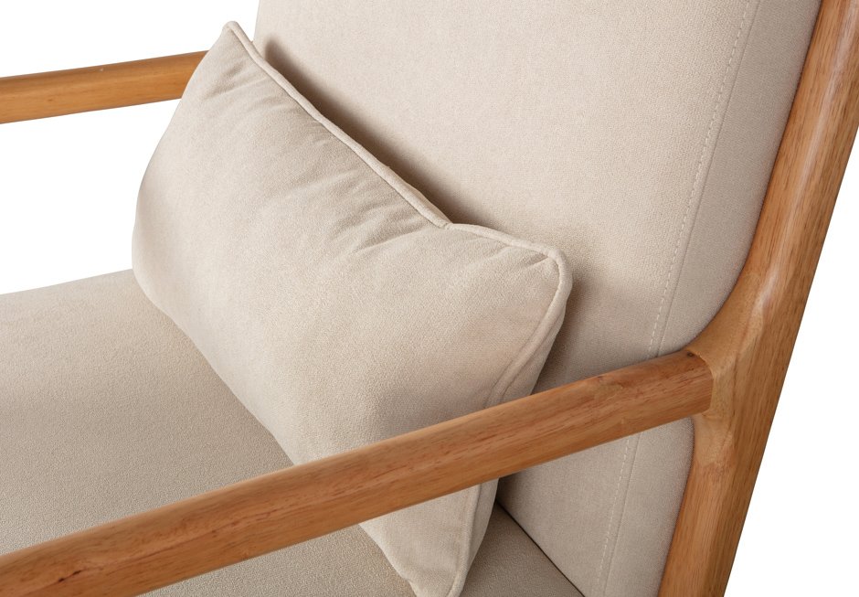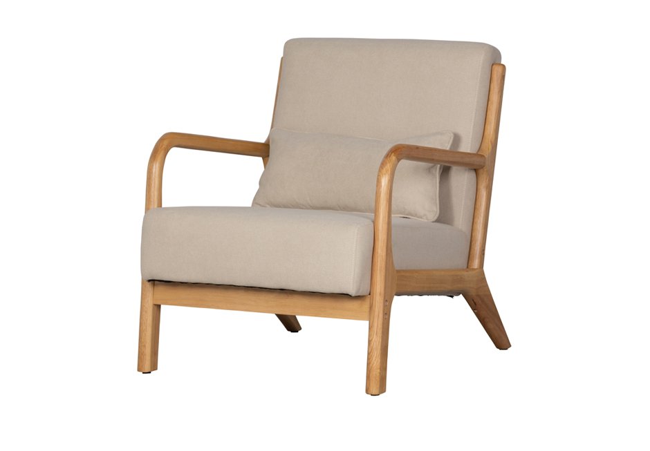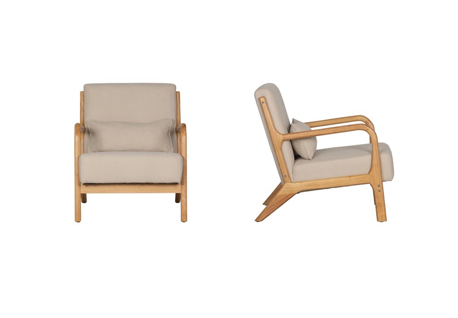 Armchair made of solid tropical rubberwood with fabric in natural color. Available in dimensions: 67x82x75h cm.