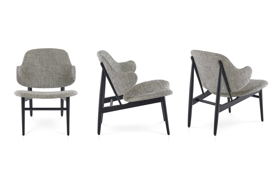 Armchair dressed with solid wood frame. Available in a variety of wood and fabric shades with dimensions of 63x75x76h cm.