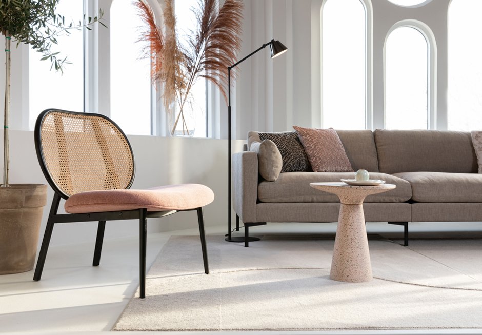 Armchair made of metal frame, with seat made of fabric in gray and pink shade and back of straw or upholstered with fabric in gray and pink shade. Available in dimensions: 78.6x70x84.1 cm.