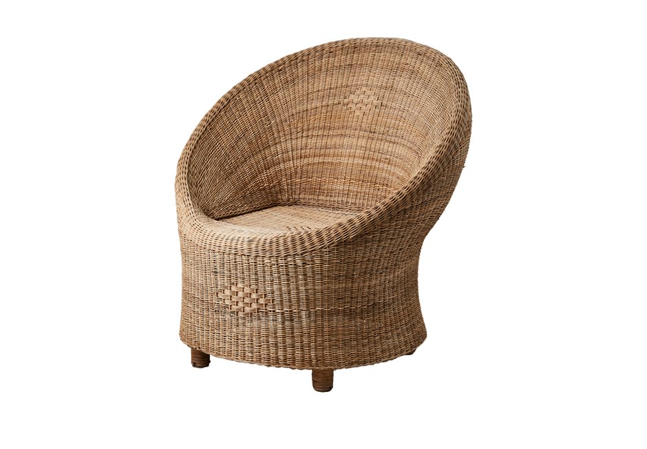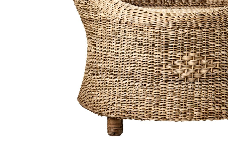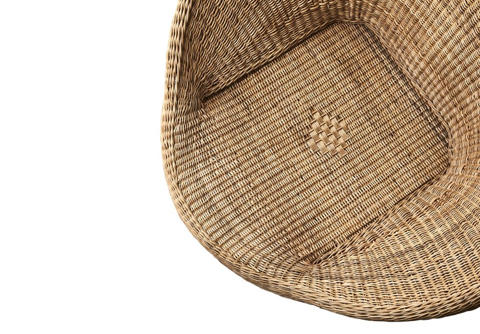 Armchair with rattan weave and other natural materials. Available in dimensions 86x55x90h cm and seat height 42h cm.
