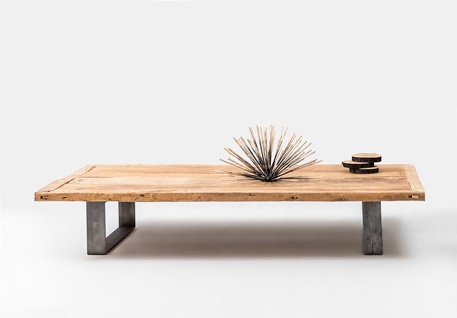 Coffee table with metal base and surface made of teak or solid oak. Available in dimensions: 200x100x33h. Upon request in a variety of materials, colors and dimensions.