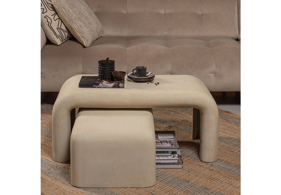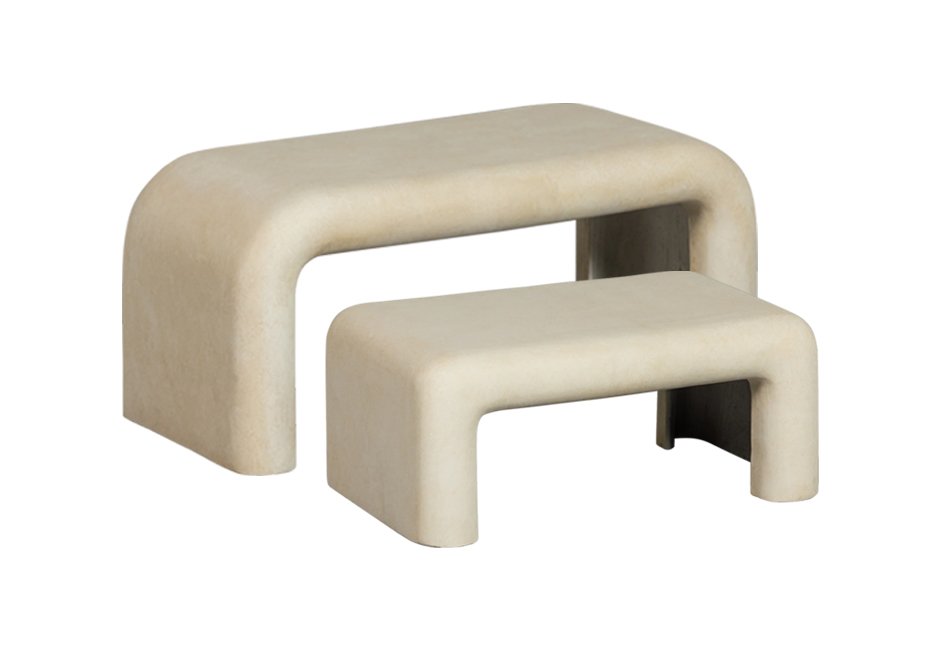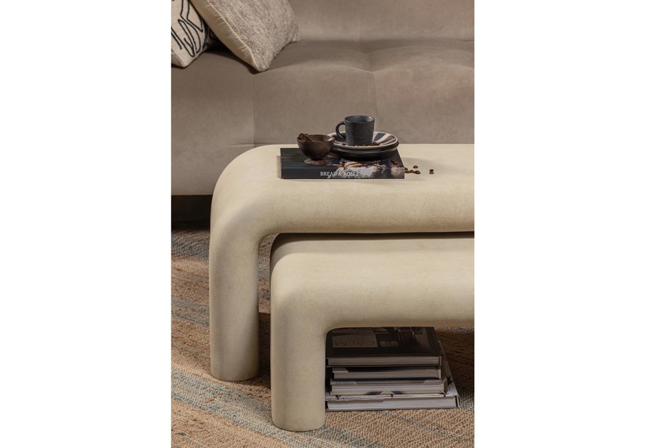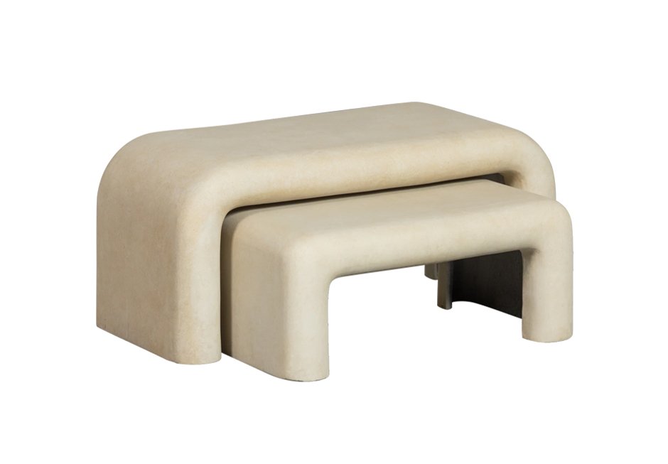Coffee tables (set of 2) made of fiber clay in natural shade. Available in dimensions 92x42x40h cm and 67x24x30h cm.