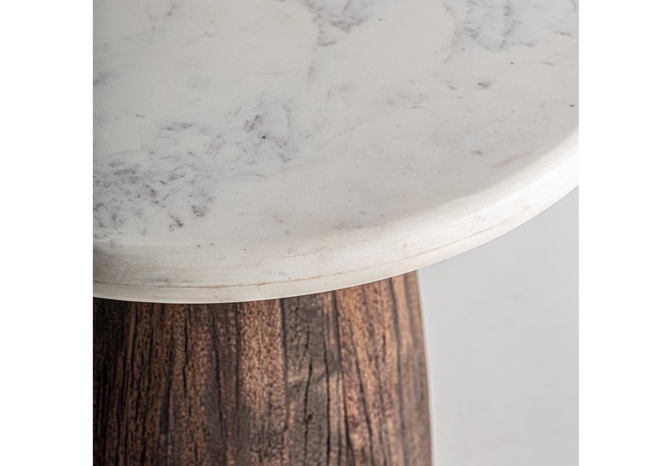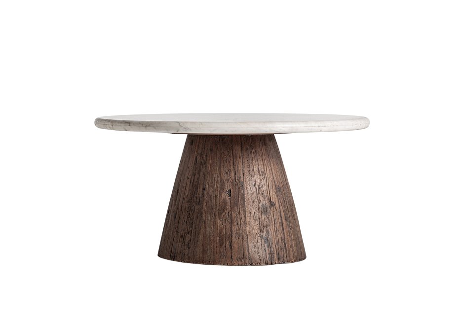 Coffee table with marble surface in white shade and base made of recycled wood. Available in dimensions Ø80x40h cm.