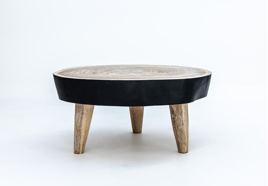 Solid suar coffee table in black color with natural surface and legs. Available in general dimensions 90x100x49h cm and surface thickness 14cm.