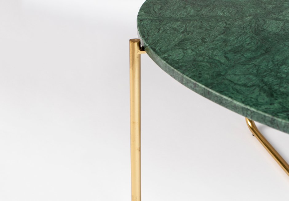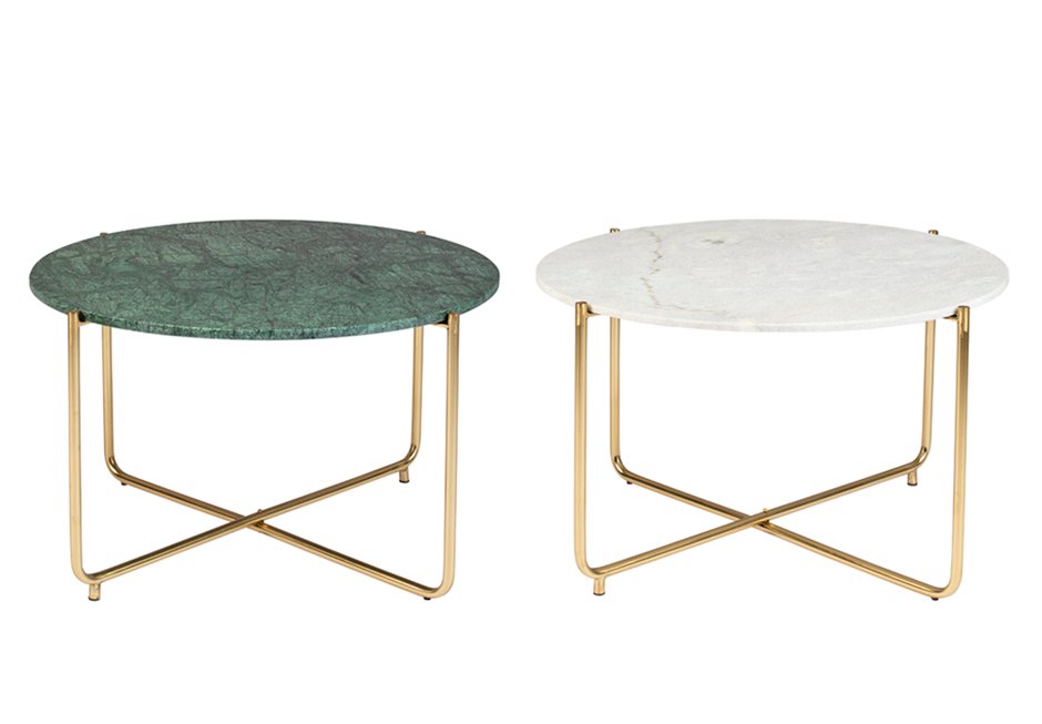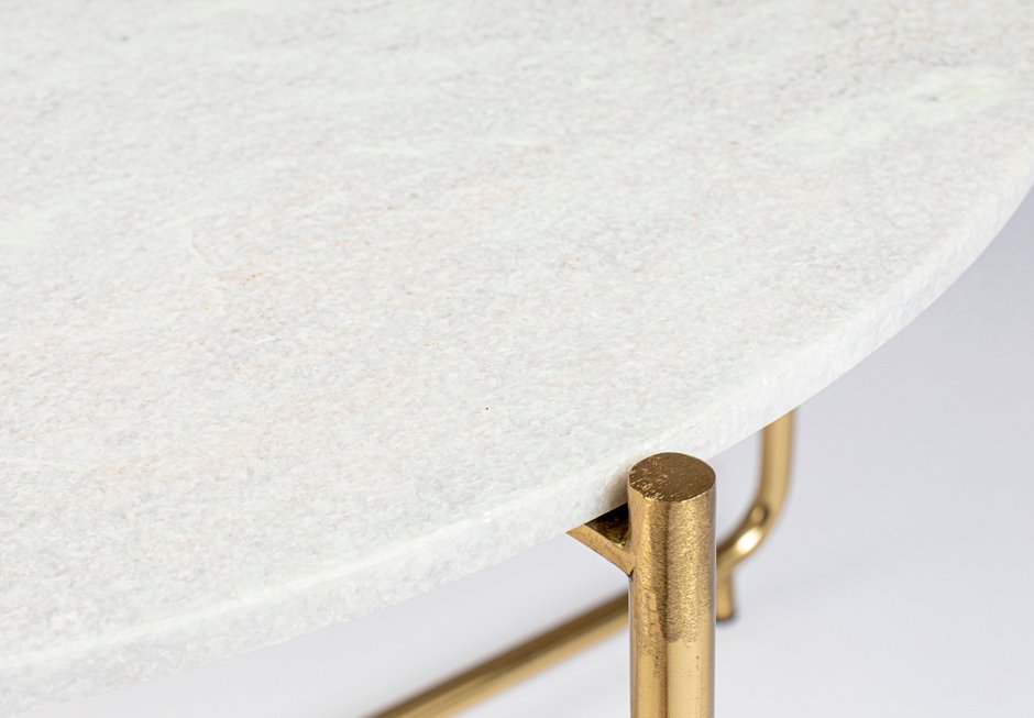 Coffee table made of gold metal base and marble surface in white and green shades. Available in dimensions Ø70x40h cm.