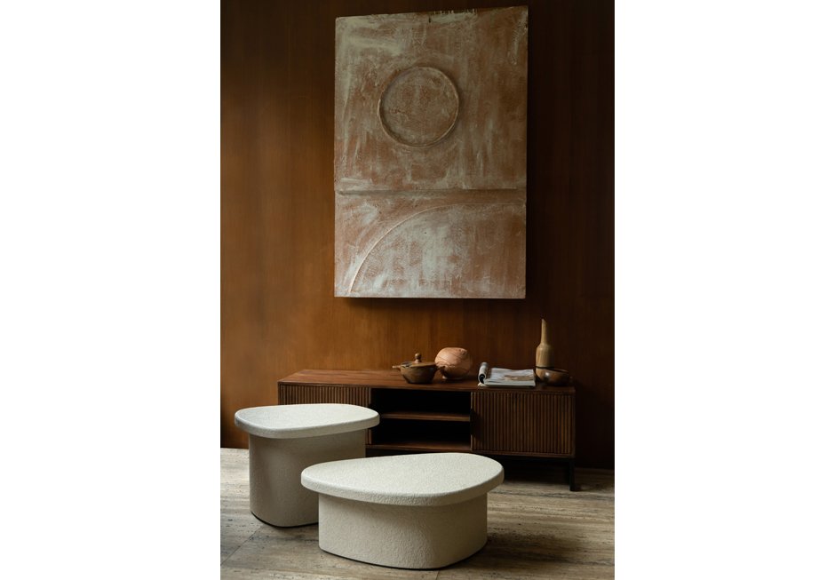 Table made of plywood and ceramic materials. Available in dimensions 74x49x28h cm.