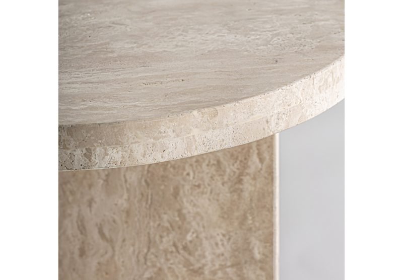 Side table made of travertine in beige shade. Available in dimensions Ø50x55h cm.
