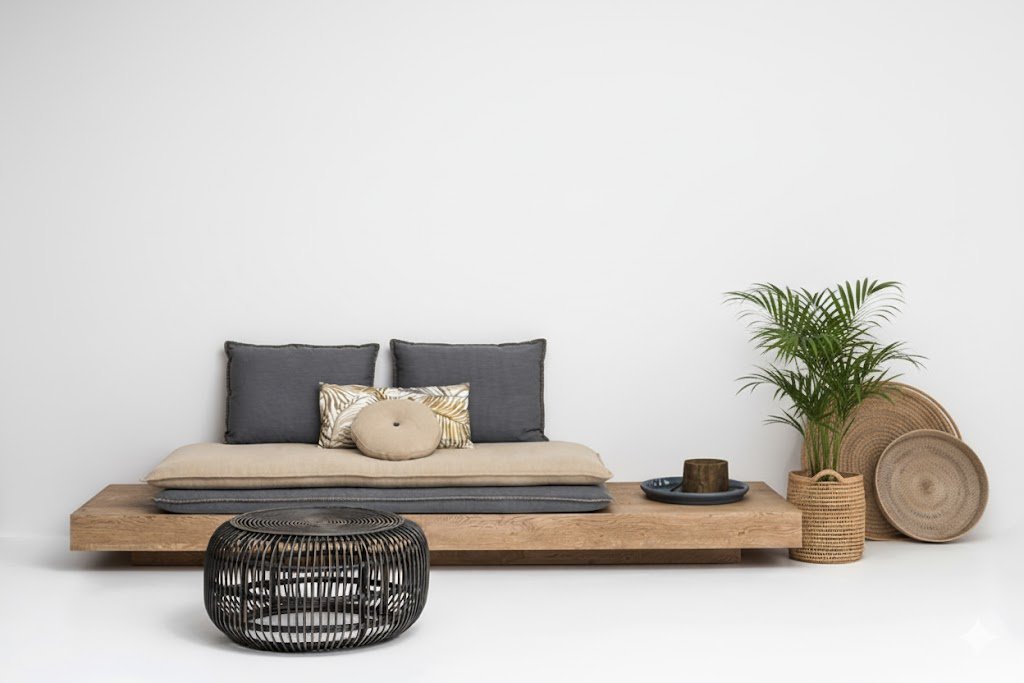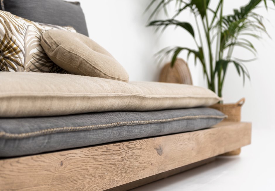 Sofa with oak base. Available in dimensions 300×80 cm, with a seat dimension of 190×80 cm, with a wide variety of fabrics, which can be removed for cleaning or replacement.