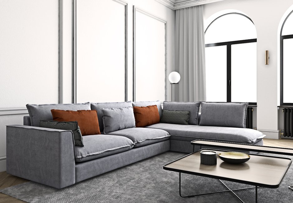 Corner sofa in dimensions 290×230 cm, with a height of 74h cm and a seat depth of 100 cm. Available with a wide variety of fabrics, which can be removed for cleaning or replacement.