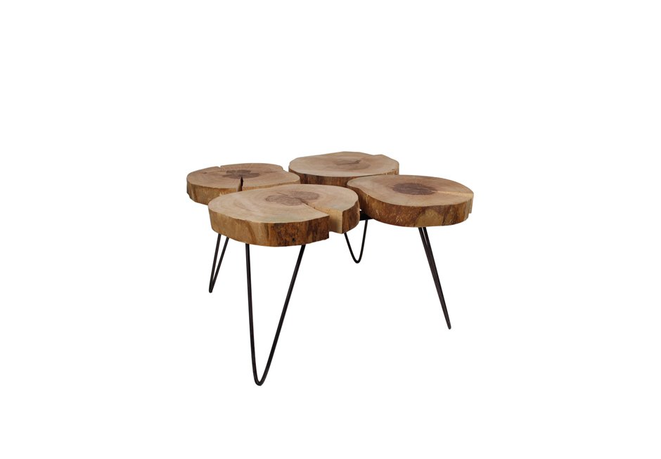 Coffee table with surface made of solid oak wood in natural trunk shape and metal black frame. Available in dimensions 80x80x45h cm with four logs, from the original price 414€ to the final offer price 81€.