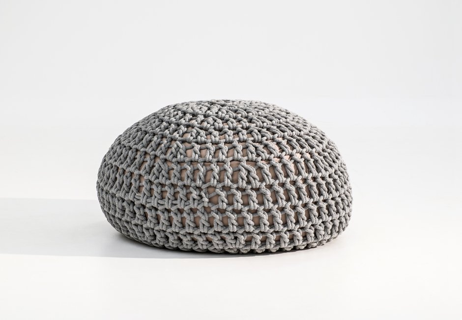 Pouf with handmade knitting, in gray shade.
