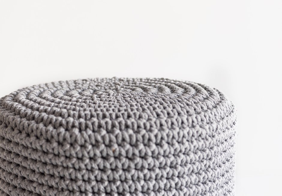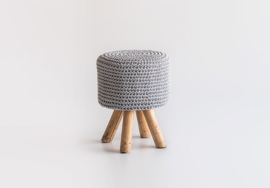 Stool with wooden base and handmade knitting.