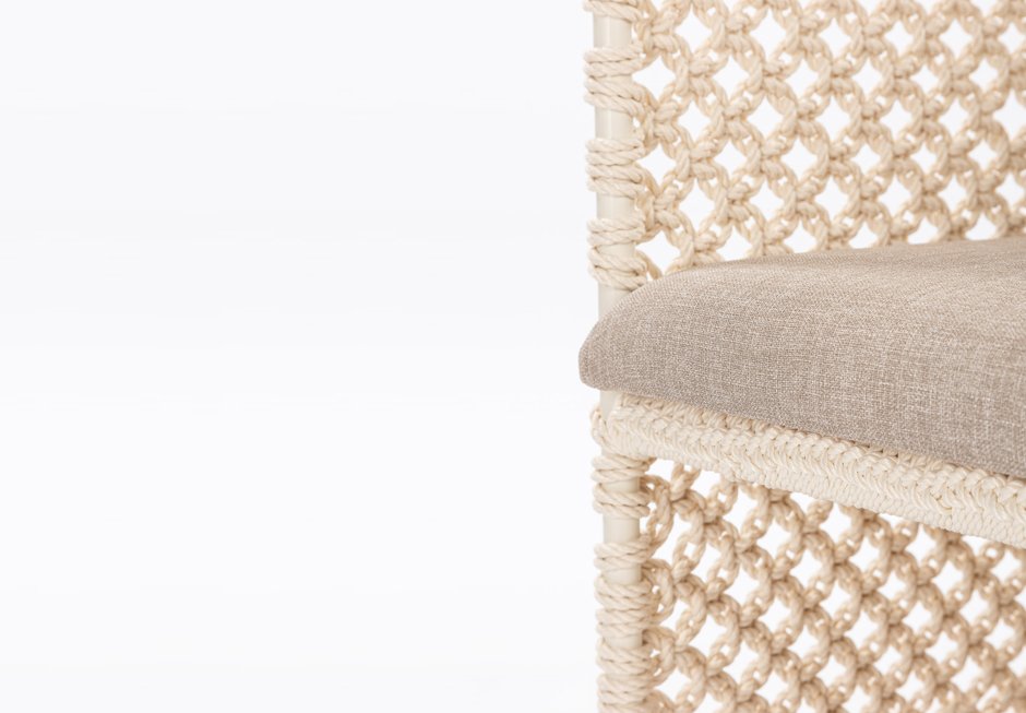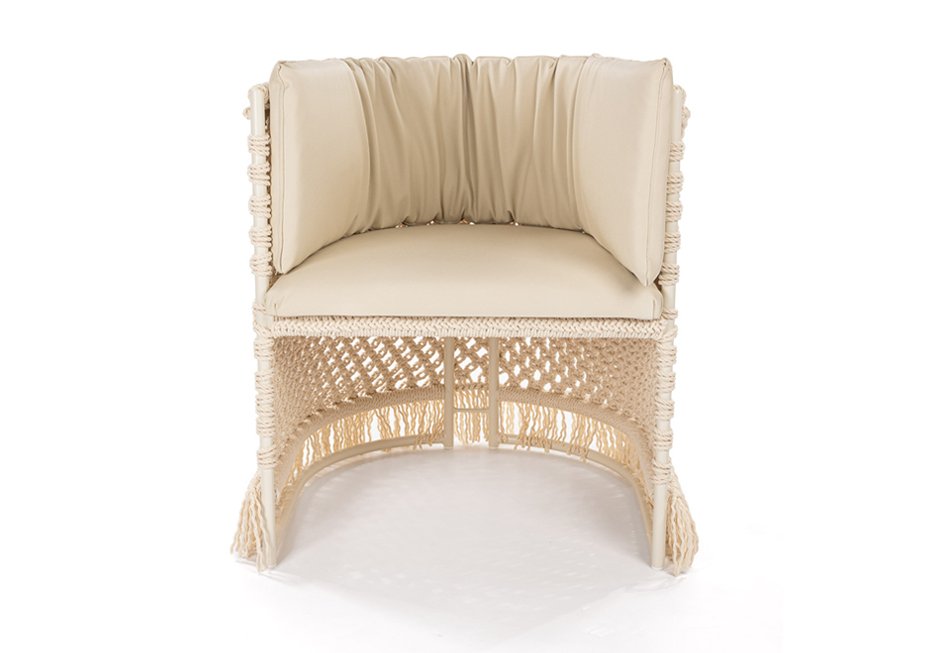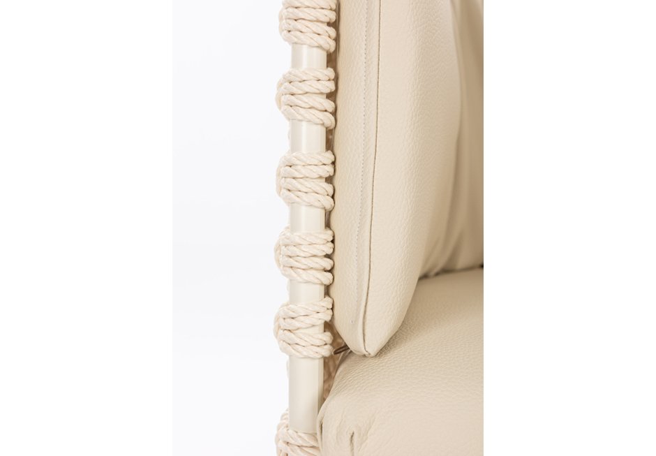 Armchair with pillow and metal frame with waterproof rope weave and UV protection.